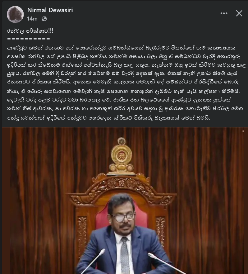 ආණ්ඩුව තමන් ජනතාව දුන් පොරොන්දුව සම්බන්ධයෙන් බැරෑරුම්ව සිතන්නේ නම් කතානායක අසෝක රන්වල ගේ උපාධි පිළිබද තත්වය තමන්ම සොයා බලා ඔහු ඒ සම්බන්ධව වැරදි තොරතුරු ඉදිරිපත් කර තිබේනම් එක්කෝ අස්වන්නැයි බල කළ යුතුය. නැත්නම් ඔහු ඉවත් කිරීමට කටයුතු කළ යුතුය. රන්වල මෙහි දී වරදක් කර තිබේනම් එහි වැරදි දෙකක් ඇත. එකක් නැති උපාධි තිබේ යැයි ජනතාවට ප්රකාශ කිරීමයි. අනෙක මෙවැනි කාලයක මෙවැනි දේ සම්බන්ධව ප්රසිද්ධියේ බොරු කියා, ඒ බොරු සගවාගෙන මෙවැනි කැපී පෙනෙන තනතුරක් දැමීමට හැකි යැයි කල්පනා කිරීමයි. දෙවැනි වරද පළමු වරදට වඩා බරපතල වේ. ජාතික ජන බලවේගයේ ආණ්ඩුව දැනගත යුත්තේ තමන් හිස් ආවරණ, පා අවරණ හා අනෙකුත් ශරීර අවයව සදහා වූ ආවරණ නොමැතිව ප්රබල වේග පන්දු යවන්නන් ඉදිරියේ පන්දුවට පහරදෙන ක්රිකට් පිතිකරු බලකායක් මෙන් බවයි.