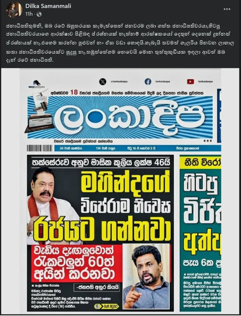 ජනාධිපති අනුර දිසානායක මහතා විසින් අලුත්ගම ප්රදේශයේදී පැවති ජන හමුවක් අමතමින් සිදු කරන ලද ප්රකාශයකට ප්රතිචාර දක්වමින් ඇය මෙම අදහස් පළ කරයි.