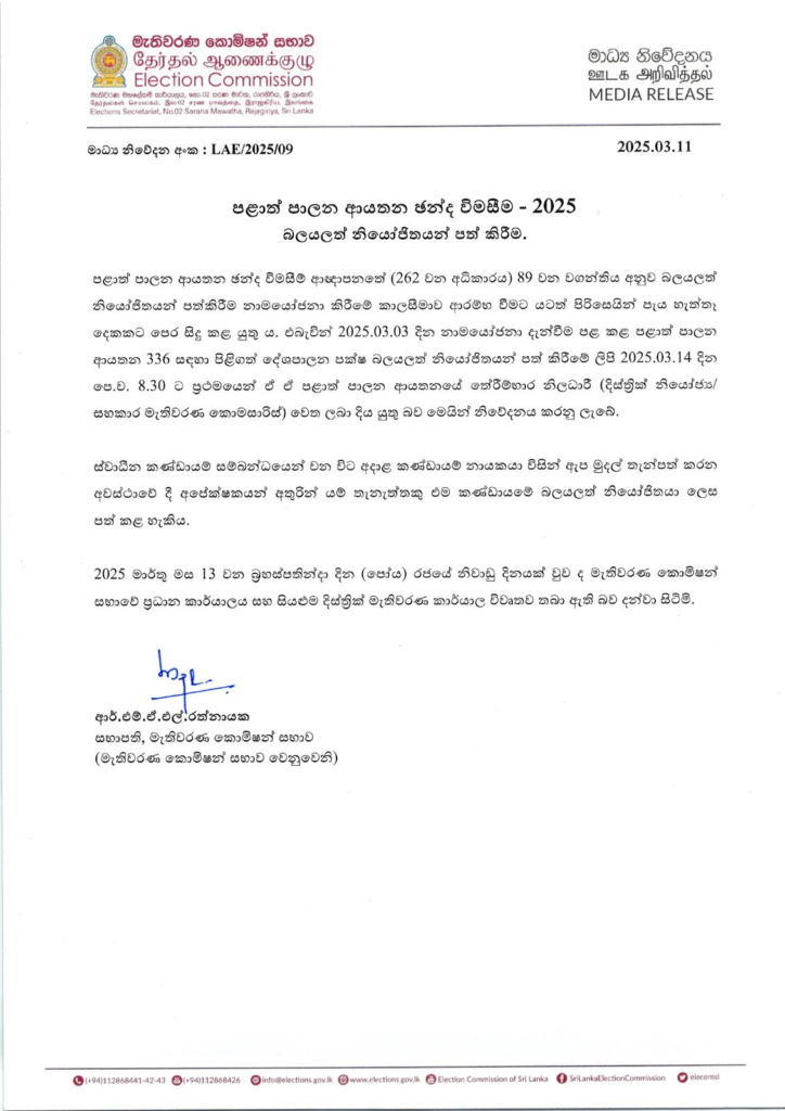 ඒ පිළිබඳව මැතිවරණ කොමිසම විසින් නිකුත් කළ නිවේදනය පහතින්,